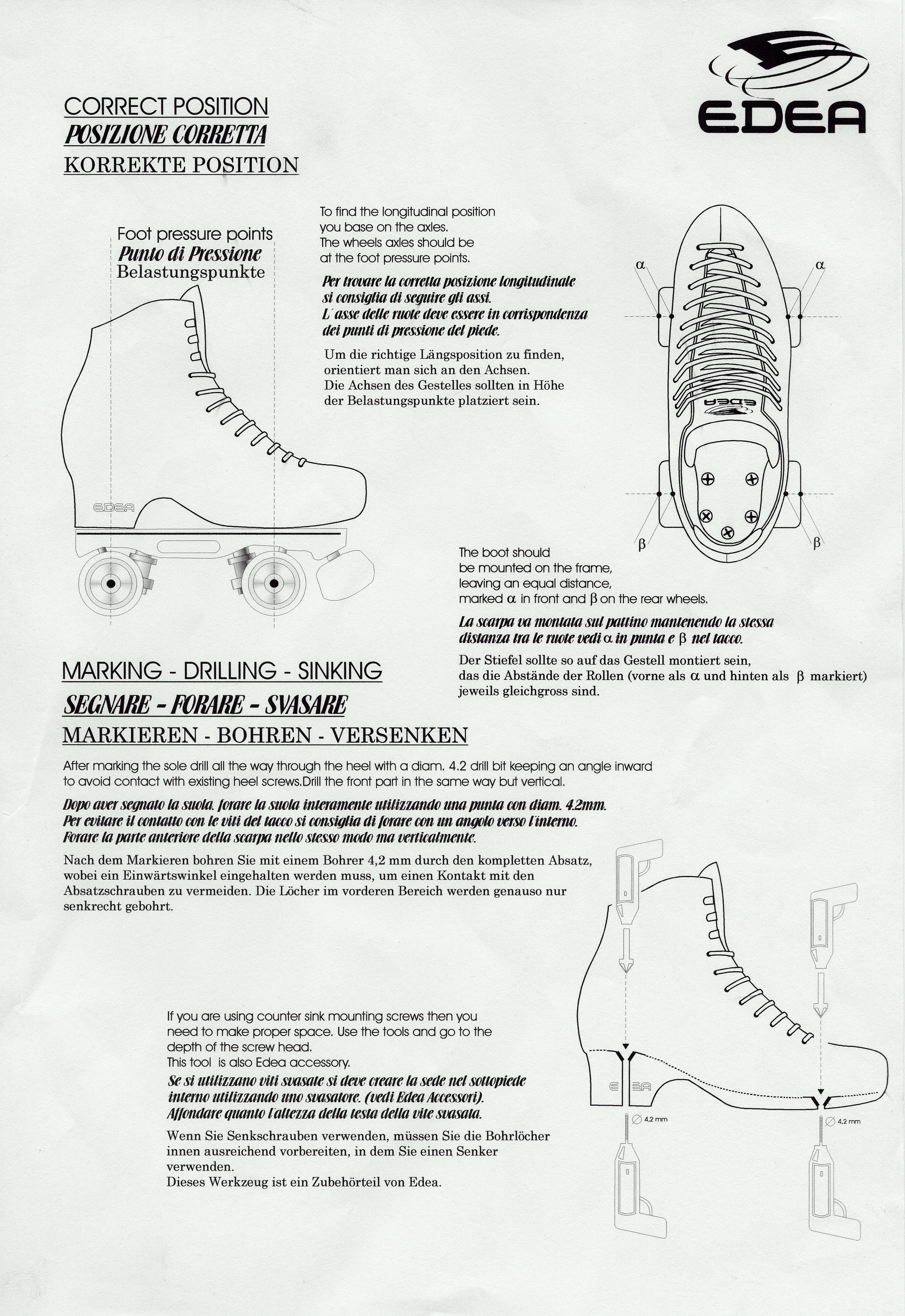 Auswahl der Größe und die Platzierung unter der Sohle - genannt "Montage" oder engl. "Plate Mounting" - ist keine Hexenkunst, aber trotzdem ein Mix aus Handwerk, Erfahrung, mit einem Schuss Kunst. Die Kunst resultiert aus der Vielfalt der Möglichkeiten, ob bei der Art des Schuhs - von Kunstlaufschuh bis Turnschuh, des Gestells und des Einsatzes. Schon die Frage des richtigen Abstandes zwischen den Achsen bietet Raumfür lange Diskussionen.